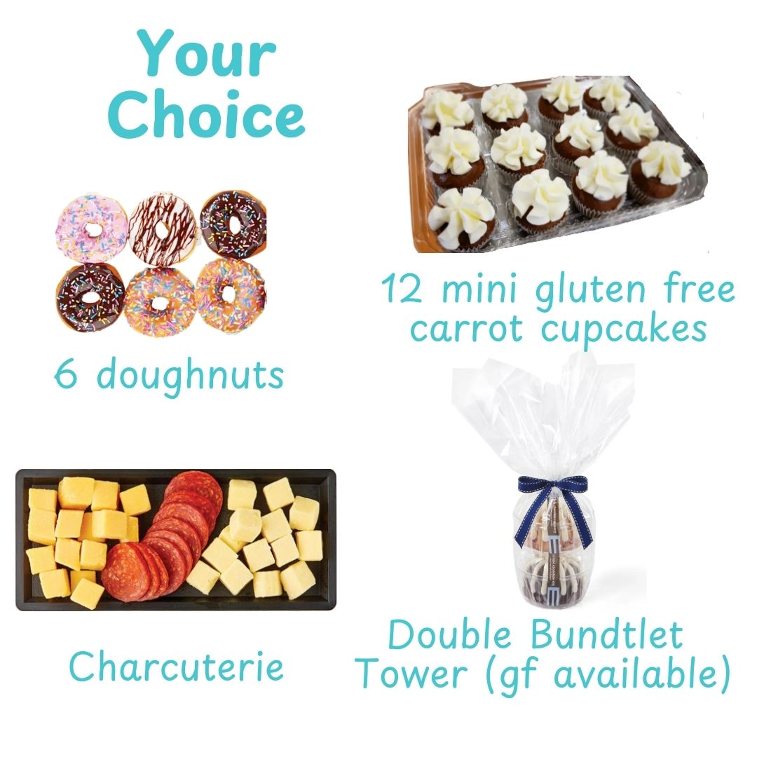 Fresh Treat of Your Choice – Choose from doughnuts, gluten-free carrot cupcakes, a meat & cheese tray, or a twin bundtlet tower for a custom touch.